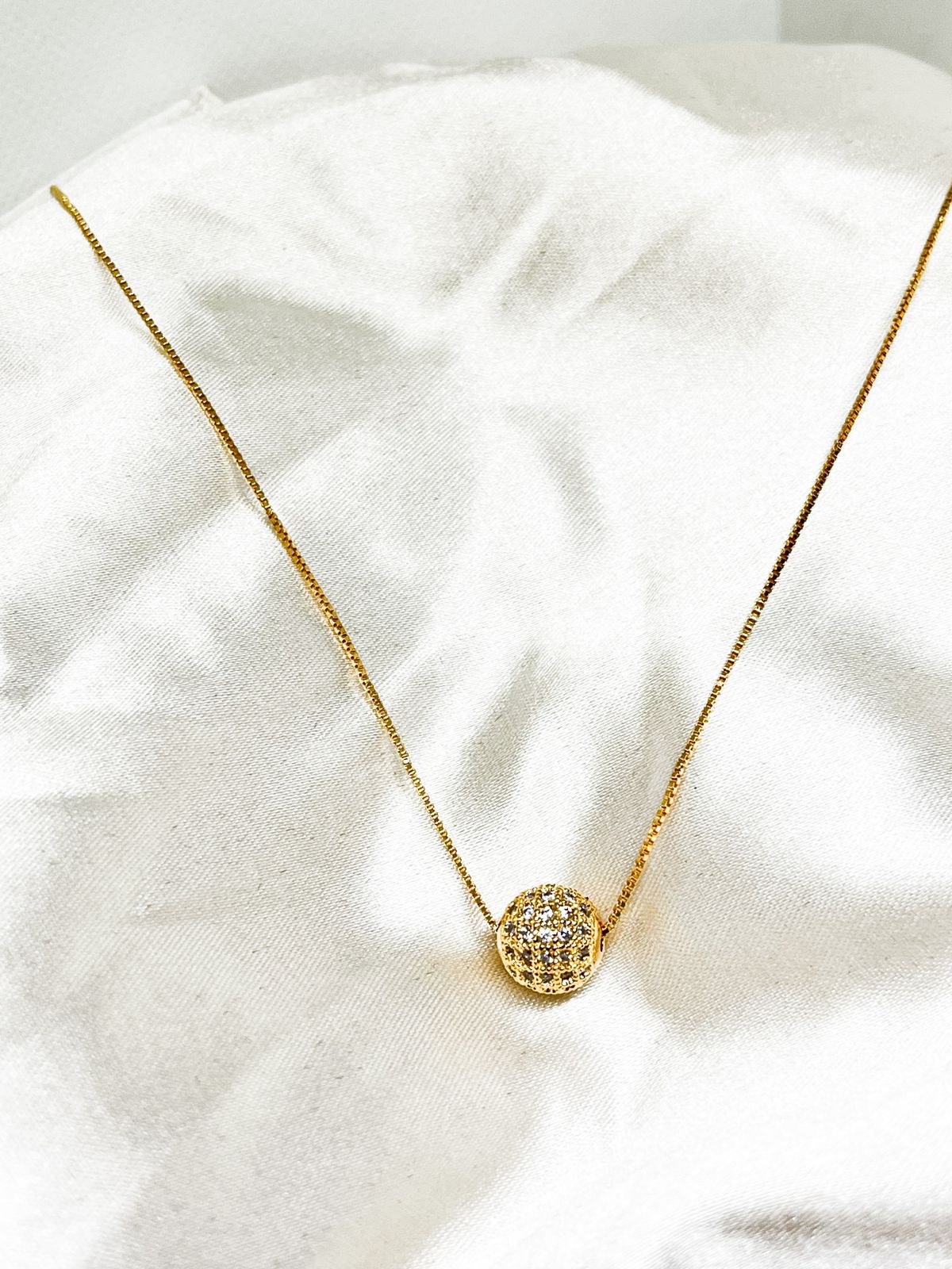 Este colar com bola cravejada é a definição de sofisticação e estilo. Com uma bola delicadamente cravejada de pedras brilhantes, ele é o toque perfeito para dar um charme extra ao seu look, seja para um evento especial ou para o dia a dia.