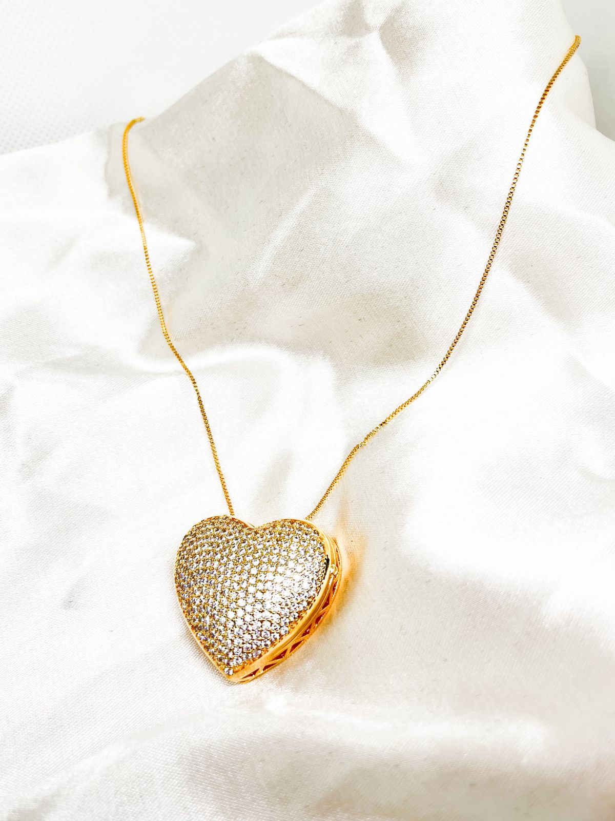 Para quem busca elegância e sofisticação, este colar é a escolha perfeita! Com um coração cravejado de zircônias que brilham como diamantes, e um relicário delicado, ele traz um toque de luxo e muito significado para seu look.